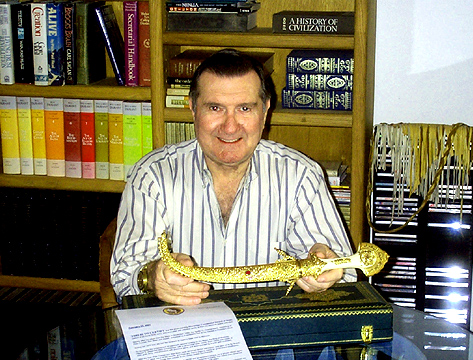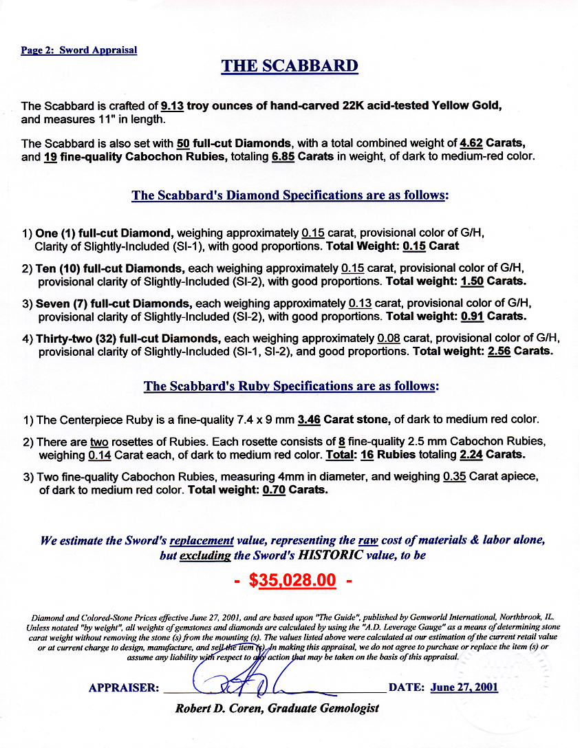 Each sword was comprised of over one troy pound of hand-carved 22K gold, encrusted with gems,