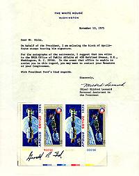 An Apollo-Soyuz plate block, affixed with museum-corners to a transmittal letter dated November 10, 1975. Signed by Gerald Ford as President on the margin of the stamps!